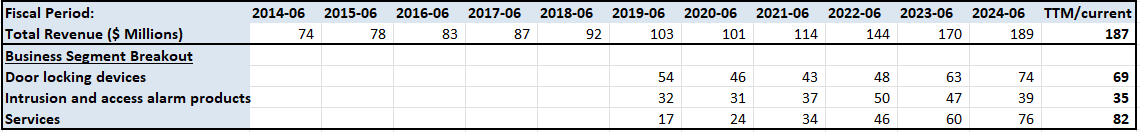 As seen above, the Revenues have grown steadily over the last 10 years with a recent TTM slow down, and I have provided the revenue by segment going back to 2019. What’s important to see here is that the Recurring Service Revenue over the last 6 years has gone from the smallest segment to now the largest. Based on current trajectory it will become over 50% of the revenues in due time and as mentioned this has the highest margins and most consistent income stream. Due to this, I believe we will start to see more consistency from their revenue as well as margin expansion each and every year. As long as they are selling new door locking devices and new alarm products, that means they will bring online more recurring service revenues plus hopefully maintain the systems previously sold. This will create the fly wheel of more services revenues and more revenues at a higher margin that will fall to the bottom line.