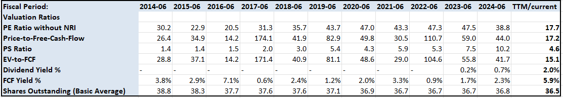 PE Ratio w/o Non Recurring Items - Historical low at 17 PE. I believe this is a very fair valuation and part of the pull back in stock price comes from the slow down in revenues. As mentioned, we are starting to see the shift to recurring revenues, and overtime those will continue to make up a larger share and increase their earnings. Hopefully, this means the price will start to follow.